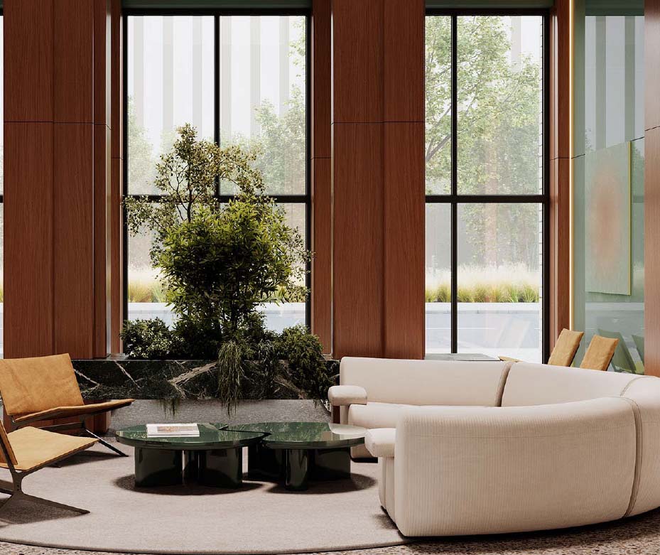 Интерьеры выполнены в современном минималистичном стиле с использованием премиальных материалов. Пространство организовано так, чтобы сочетать эстетику, комфорт и функциональность.
